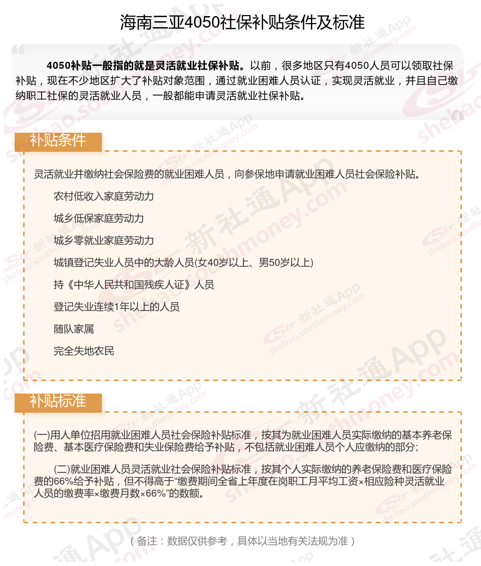 一、2023-2024年海南三亚4050社保补贴标准及条件是多少?