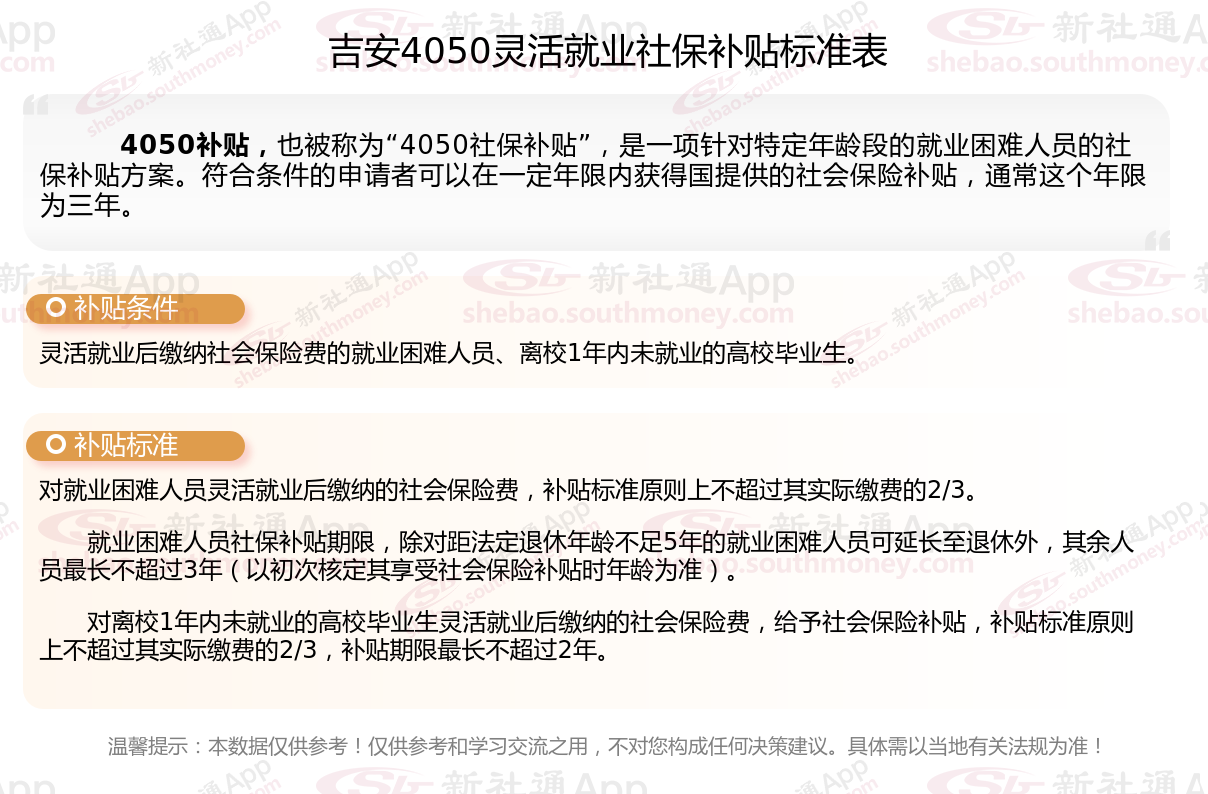 2025吉安4050补贴主要针对的是年龄在40岁以上的女性和50岁以上的男性,这些人群通常因为年龄较大而面临就业困难。