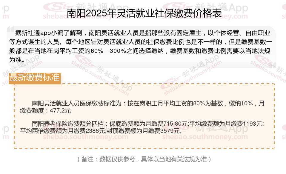 南阳灵活就业人员的社保缴费标准是多少?根据新社通app-社保缴费查询工具提供的最新数据如下: