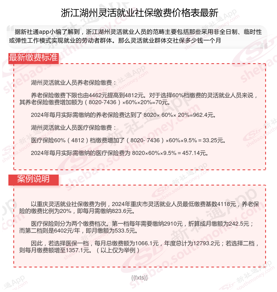 据新社通app数据显示,浙江湖州灵活就业养老保险最低缴费基数为:4462元;个人的缴费比例分别为:20%;