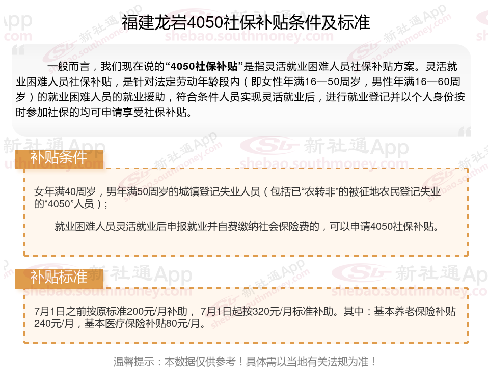 一、福建龙岩4050社保补贴标准及条件2025年最新消息
