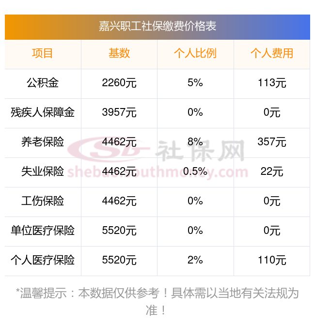 嘉兴社保个人缴费比例是多少?和社保网小编一起来看看2024-2025年嘉兴最低社保费用明细参考,新社通app-社保缴费查询工具提供的最新数据如下: