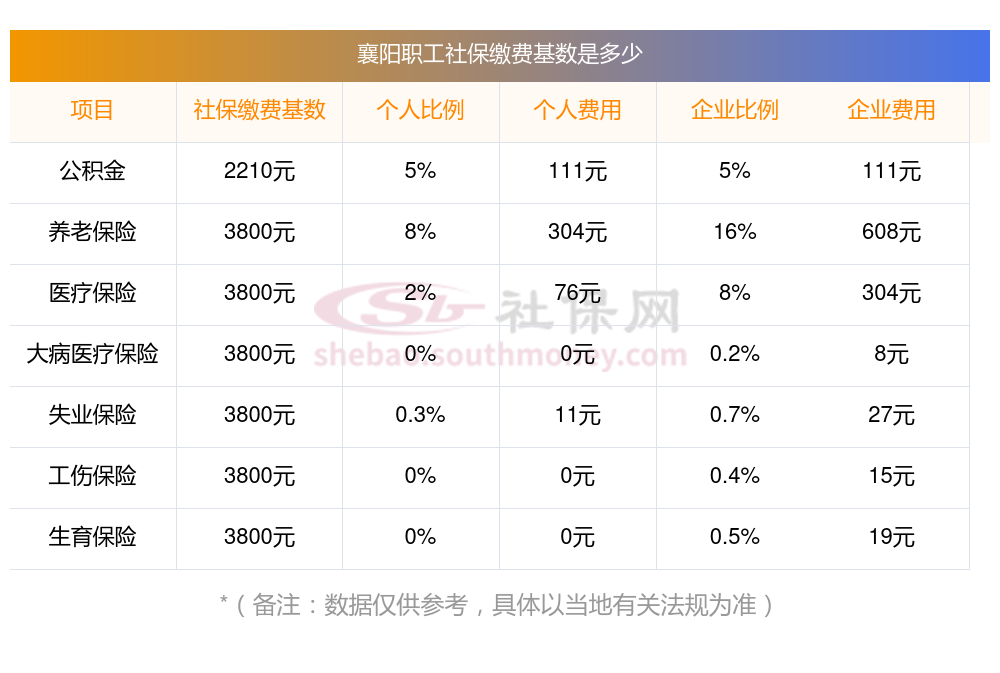 襄阳2025年社保养老保险缴费标准是多少?下表是2025年襄阳社保费用明细参考,新社通app-社保缴费查询工具提供的最新数据如下: