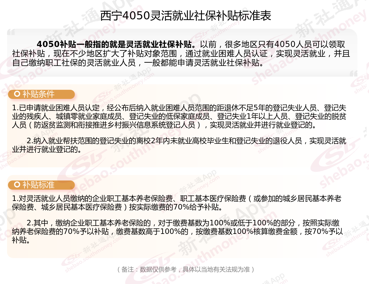 4050补贴主要是针对大龄就业困难人群的社保补贴,申请条件包括年龄、就业困难、灵活就业并自费缴纳社保,需要持有失业登记证,不同地区可能有细微差别,比如农村户口的限制。那么西宁4050灵活就业社保补贴标准是多少钱?西宁4050社保补贴条件是什么?接下来随新社通APP小编了解一下最新资讯。