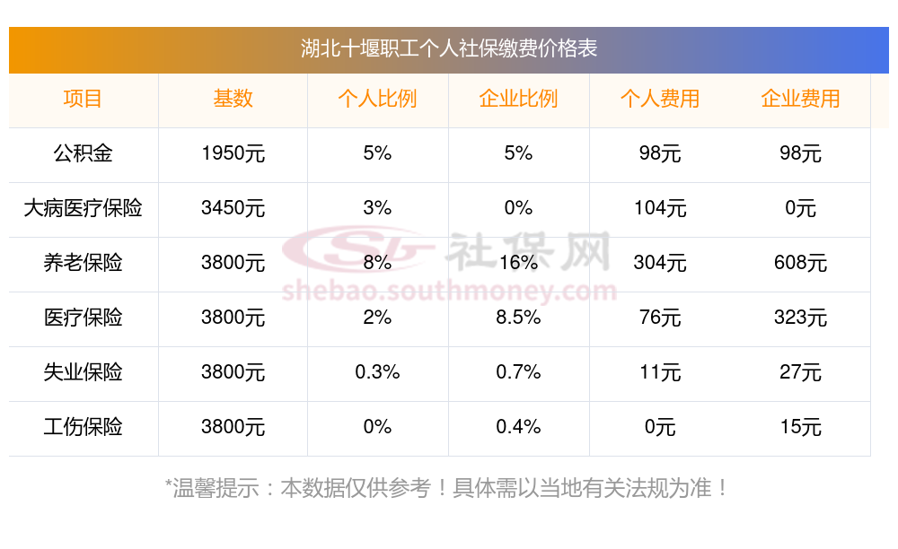 2025年湖北十堰社保缴费多少钱?下表是2024-2025年湖北十堰社保费用明细参考,新社通app-社保缴费查询工具提供的最新数据如下:
