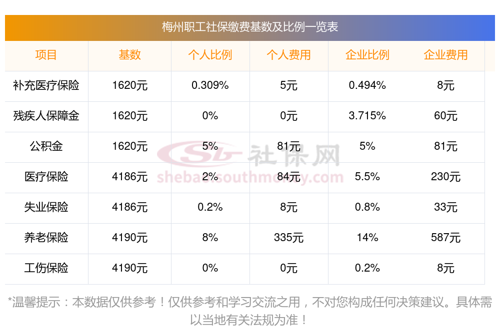 梅州五险一金交多少钱一个月?下表是2024-2025年梅州社保费用明细参考,新社通app-社保缴费查询工具提供的最新数据如下: