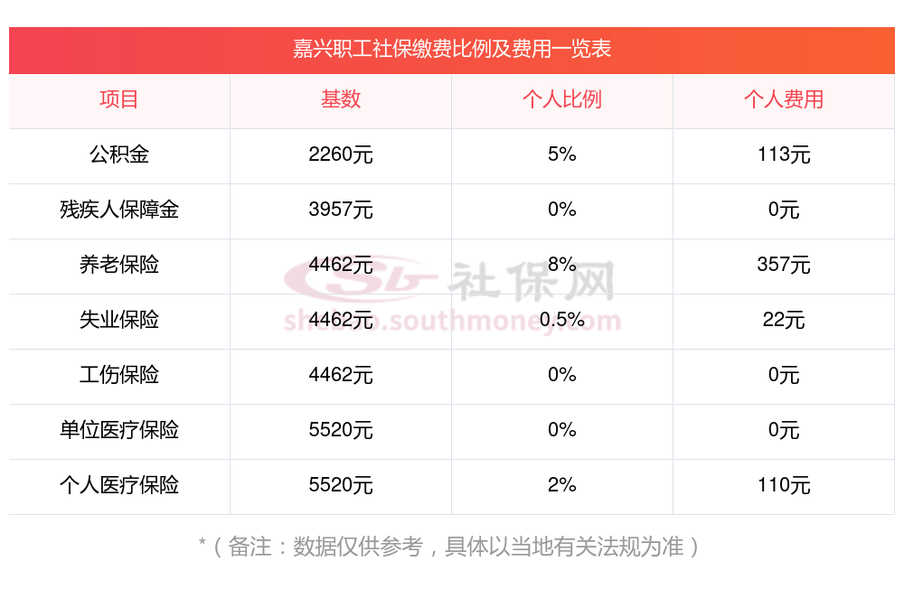 2025年嘉兴社保缴费最低基数及个人和单位具体是多少钱?下表是2025年嘉兴社保费用明细参考,新社通app-社保缴费查询工具提供的最新数据如下: