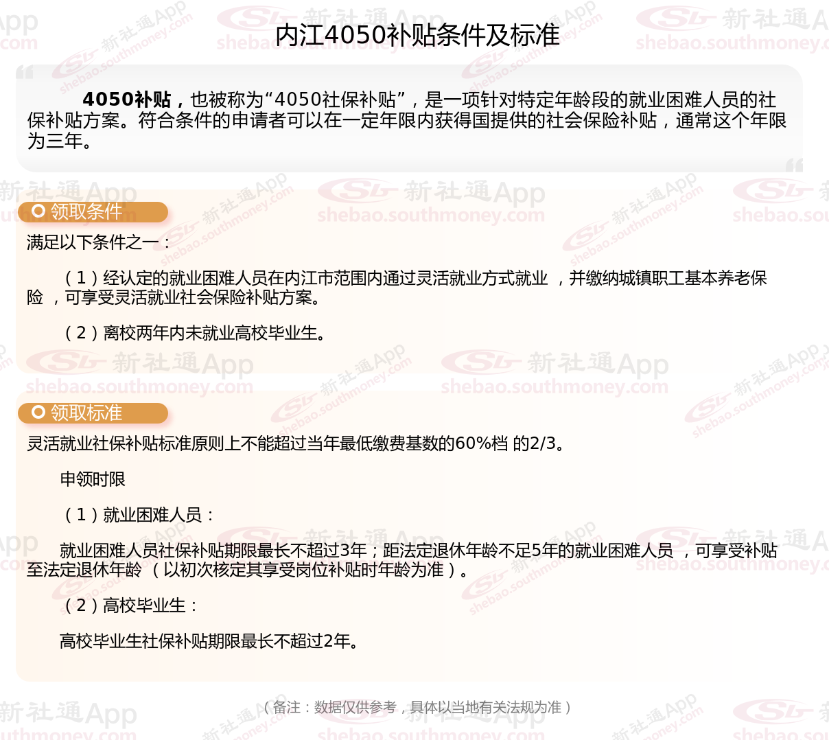 二、2025年内江4050社保补贴标准及条件,最新如下: