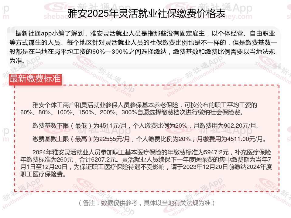 据新社通app数据显示,雅安灵活就业养老缴费基数明细如下:
