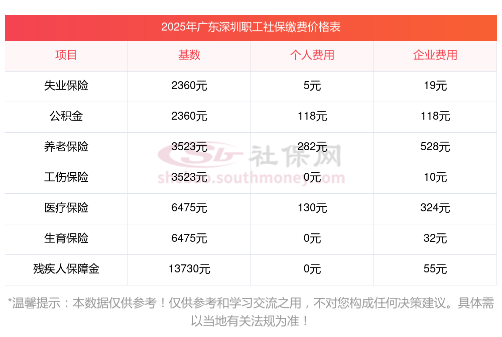 2025年广东深圳5险缴费标准是多少,2025年广东深圳社保缴费多少钱?下表是2025年广东深圳社保费用明细参考,新社通app-社保缴费查询工具提供的最新数据如下: