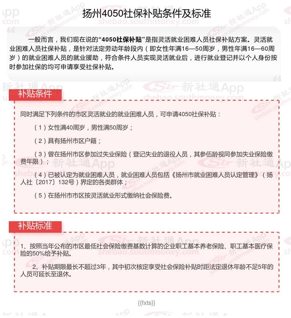 二、2025年扬州4050社保补贴标准及条件,最新如下: