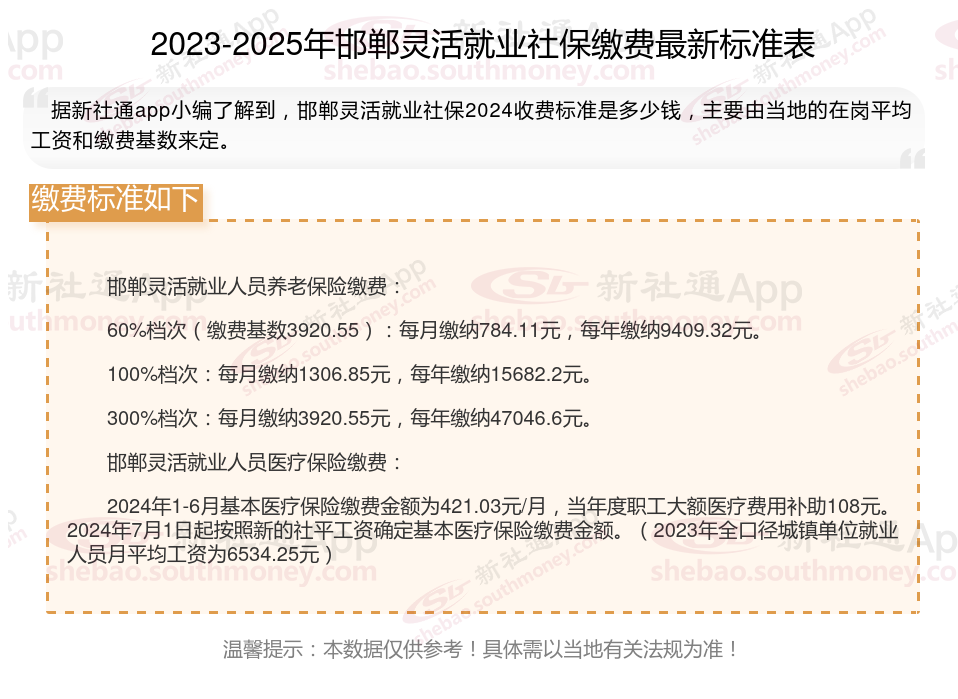 据新社通app数据显示,邯郸灵活就业养老保险缴费基数2024-2025年最新标准如下: