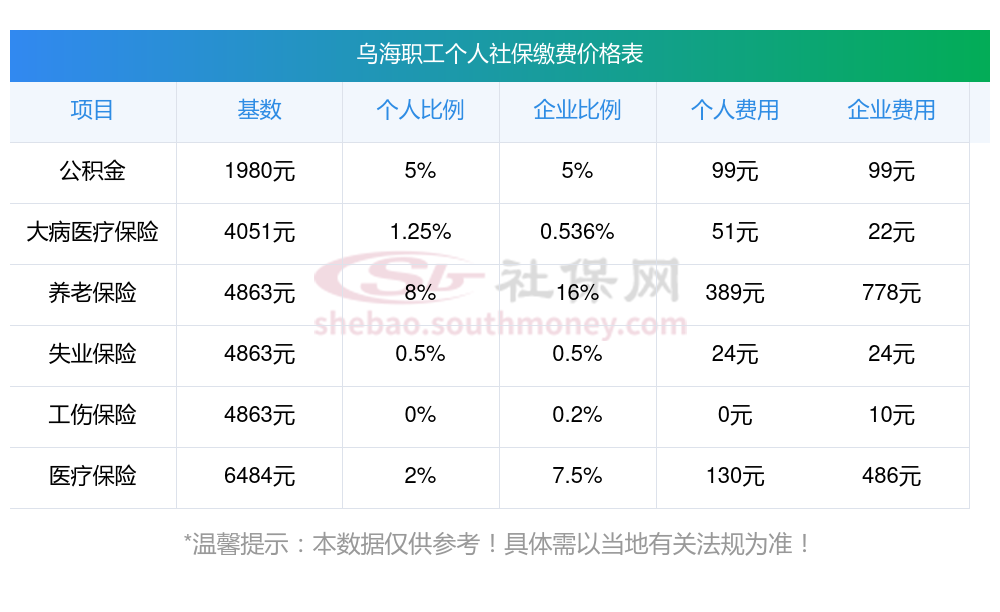 2025年乌海社保缴费多少钱?下表是2023-2024年乌海社保费用明细参考,如下: