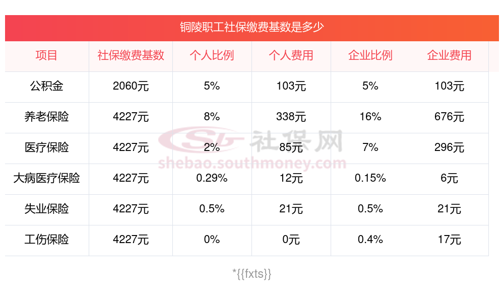 2025年铜陵社保缴费最低基数及个人和单位具体是多少钱?下表是2025年铜陵社保费用明细参考,新社通app-社保缴费查询工具提供的最新数据如下: