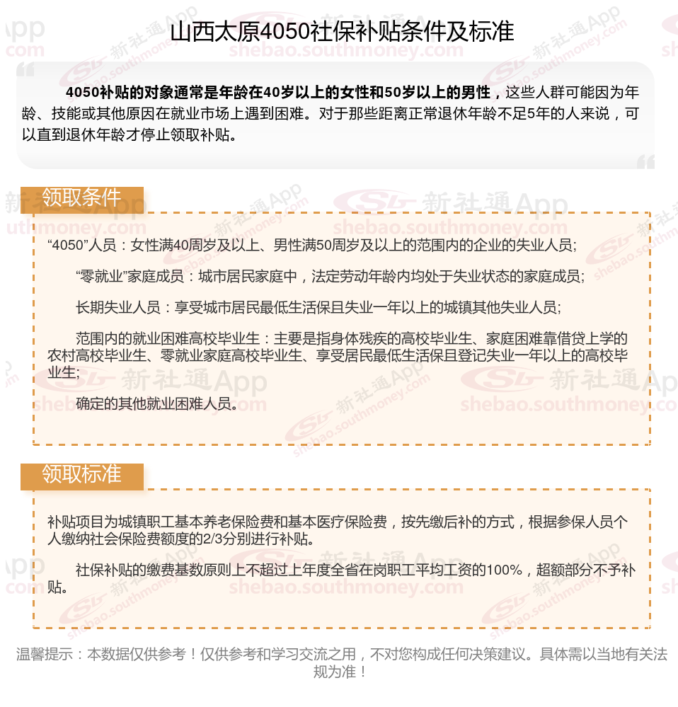 今天聊一下4050补贴的相关内容。4050补贴听起来像是一个针对特定年龄人群的社保补贴。比如女性需年满40周岁,男性需年满50周岁(以申请当年12月31日为截止日期)。那么山西太原4050灵活就业困难人员社保补贴多少钱?山西太原4050社保补贴可以申请吗?接下来随新社通APP小编具体了解一下4050社保补贴内容。