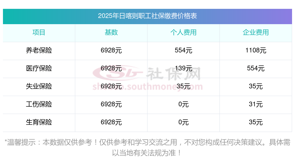 2025年日喀则5险缴费标准是多少,2025年日喀则社保缴费多少钱?下表是2025年日喀则社保费用明细参考,新社通app-社保缴费查询工具提供的最新数据如下: