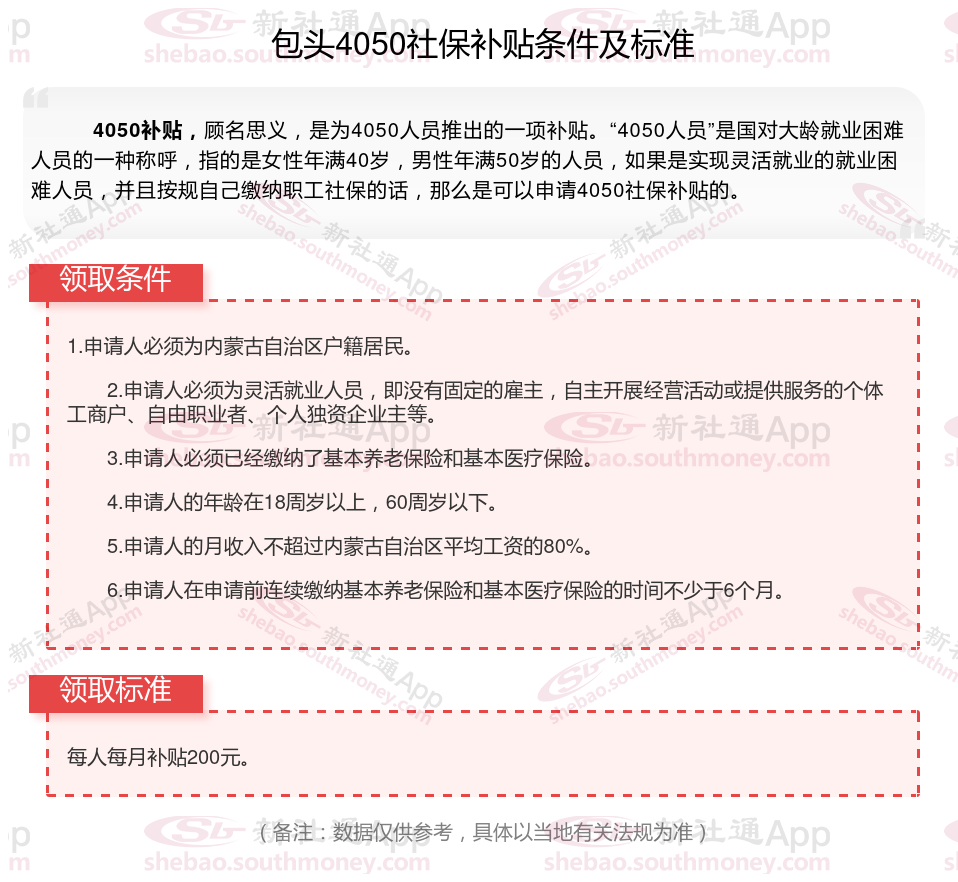 4050社保补贴标准据新社通app小编了解,通常,4050社保补贴包含基本医疗保险和基本养老保险两个险种,社保补贴金额为申请人实际缴纳基本养老保险和基本医疗保险金额的2/3,具体标准以当地社保局公布的数据为准!那么包头4050灵活就业困难人员社保补贴标准是多少?包头4050社保补贴需要符合什么条件?接下来随新社通APP小编具体了解一下4050社保补贴内容。