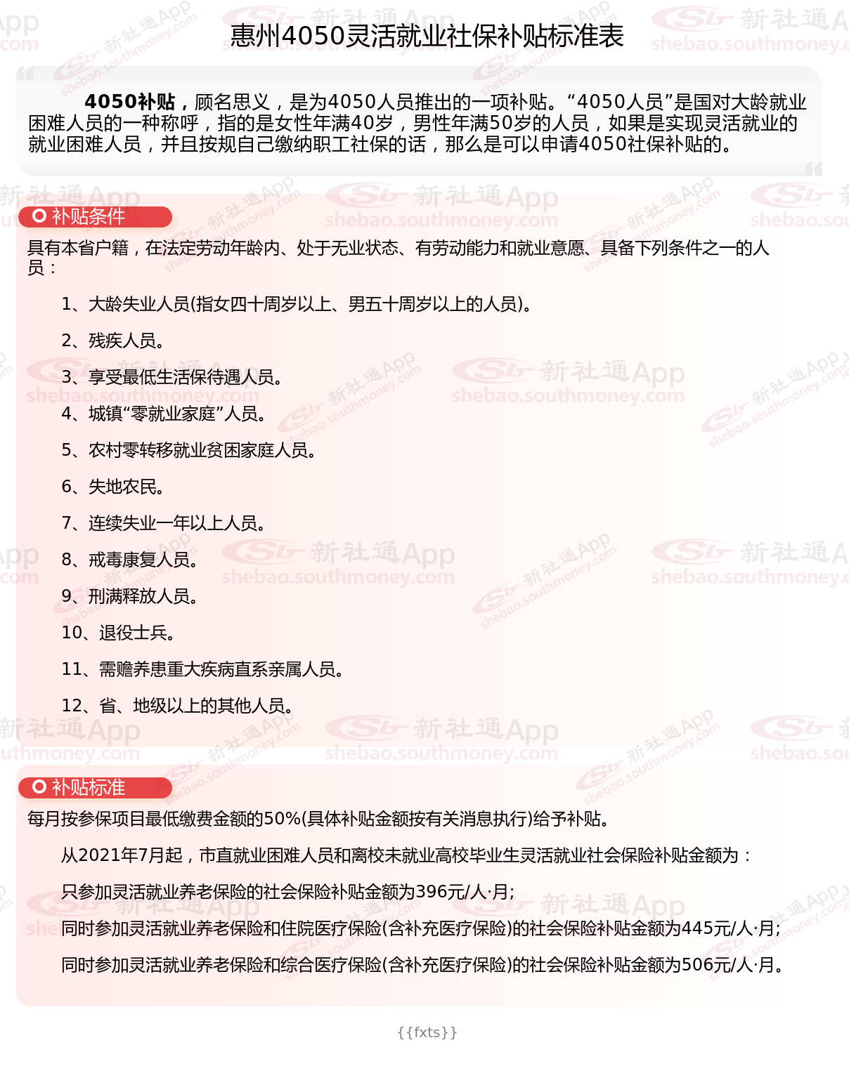 今天聊一下4050补贴话题。4050补贴听起来像是一个针对特定年龄人群的社保补贴。比如女性需年满40周岁,男性需年满50周岁(以申请当年12月31日为截止日期)。那么惠州4050灵活就业社保补贴标准是多少钱?惠州4050社保补贴条件是什么?接下来随新社通APP小编了解一下最新资讯。