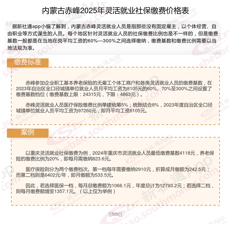 据新社通app数据显示,内蒙古赤峰灵活就业养老保险缴费基数2024-2025年最新标准如下: