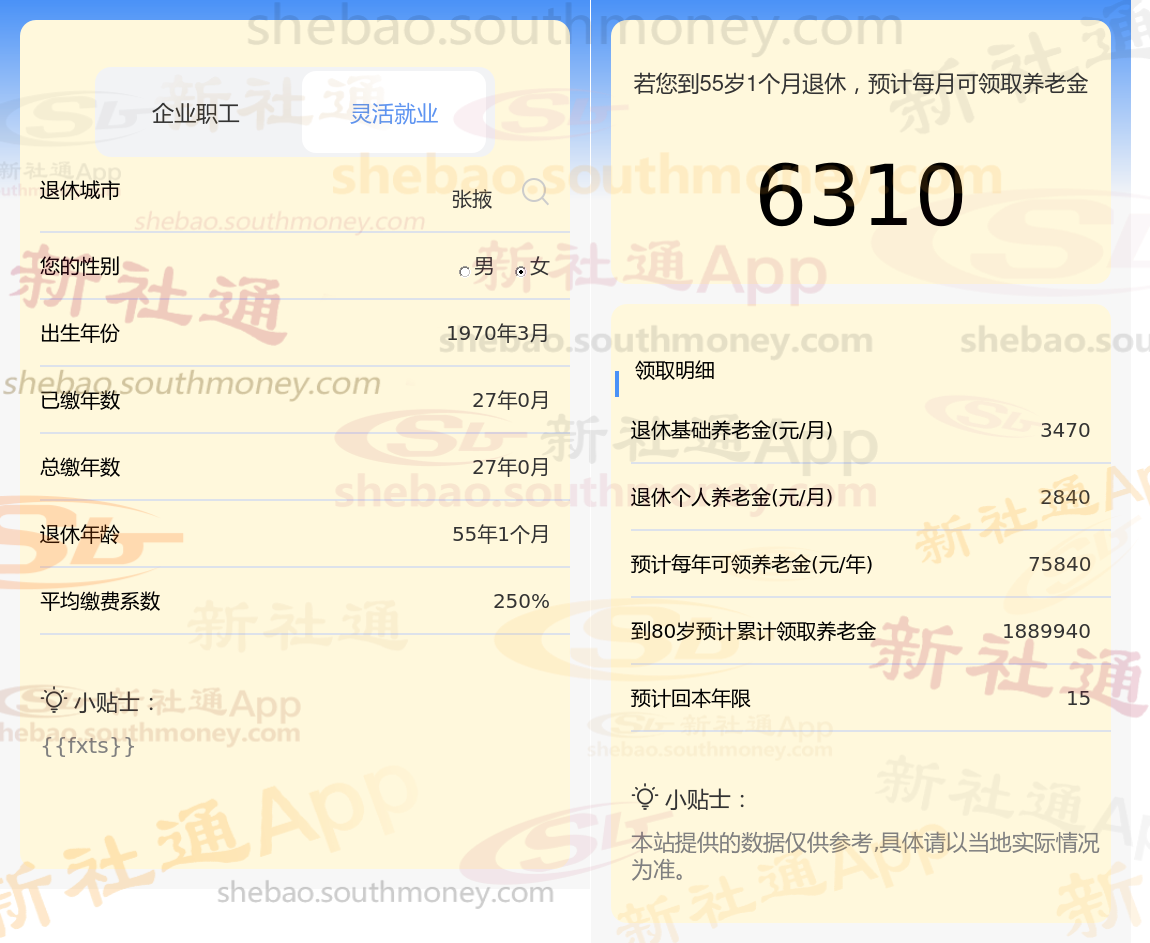 退休城市:张掖,性别:女,出生年份:1970,总缴年数27年,缴费档次:250%,新社通app养老金计算器所得:
