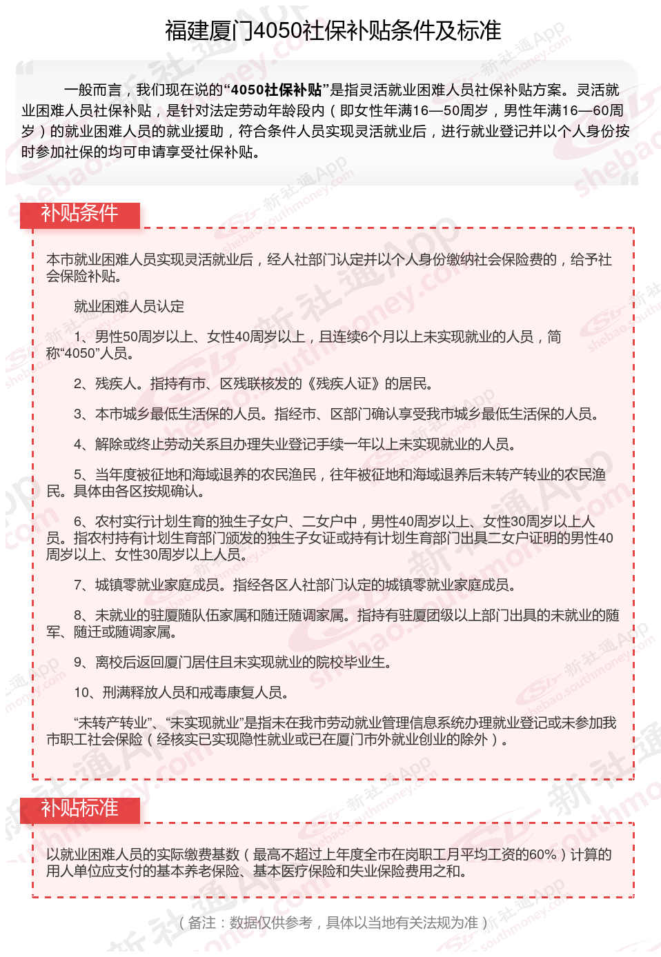 2025福建厦门4050补贴主要针对的是年龄在40岁以上的女性和50岁以上的男性,这些人群通常因为年龄较大而面临就业困难。