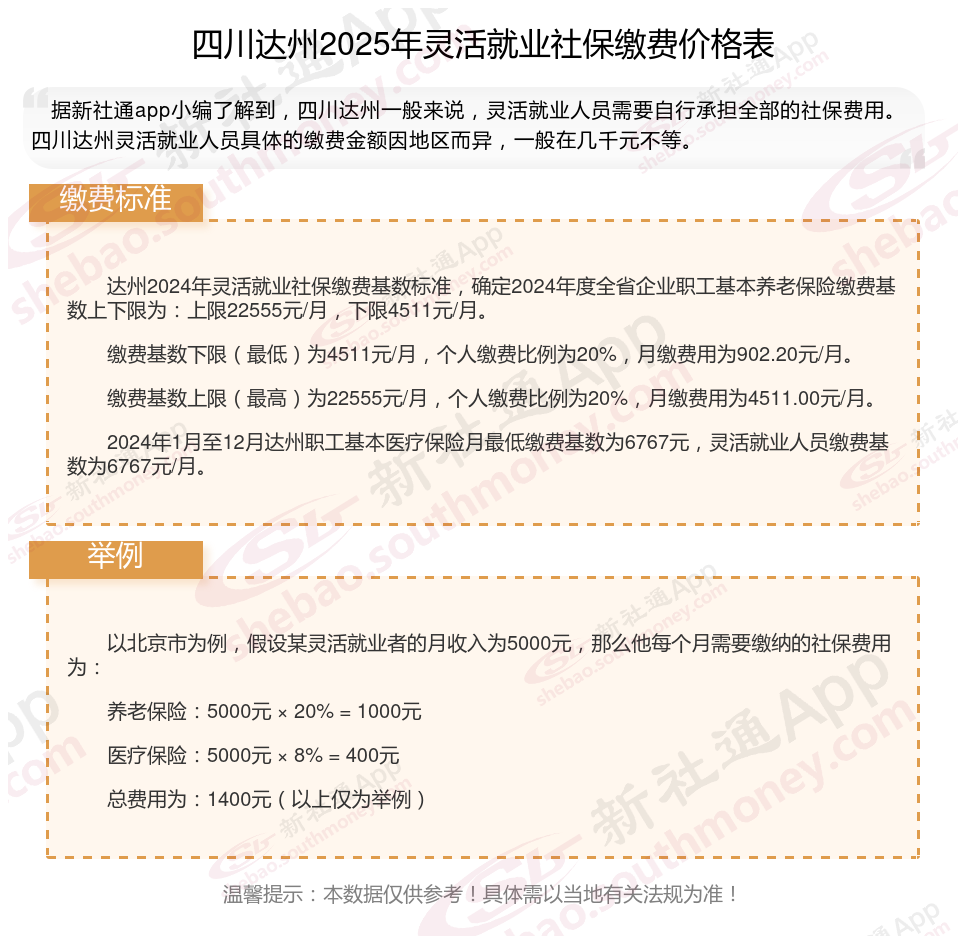 #四川达州灵活就业人员社保缴费2025年# 在当前的社保体系中,灵活就业人员作为特殊的群体,其社保缴费问题备受关注。本文就四川达州灵活就业人员社保缴费的种类和具体比例、费用,具体谈谈灵活就也人员的社保相关问题。下面随新社通小编一起来看看。