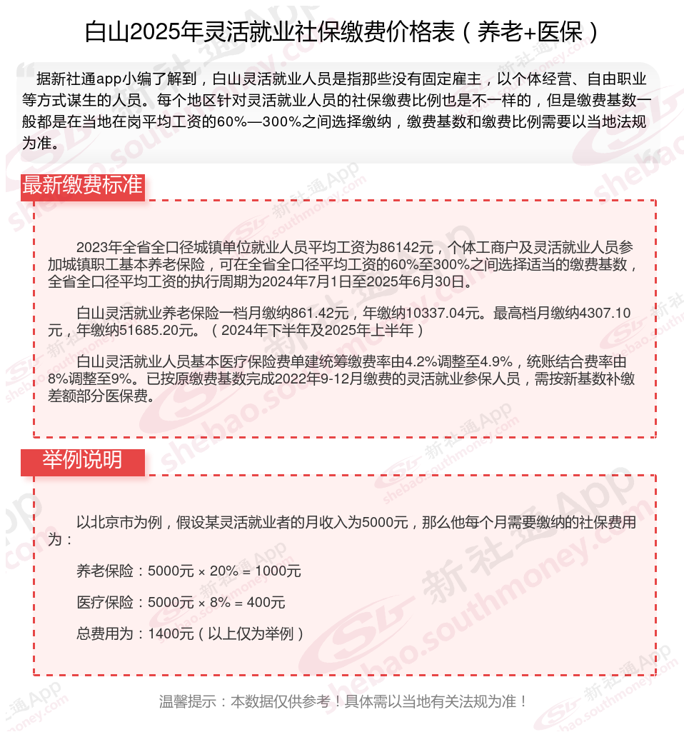 那么,白山灵活就业人员社保一个月需要交多少钱?根据新社通app-社保缴费查询工具提供的2025社保缴费标准详情数据: