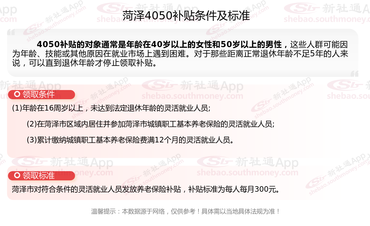 今天聊一下4050补贴的相关内容。4050补贴听起来像是一个针对特定年龄人群的社保补贴。比如女性需年满40周岁,男性需年满50周岁(以申请当年12月31日为截止日期)。那么菏泽4050灵活就业困难人员社保补贴多少钱?菏泽4050社保补贴可以申请吗?接下来随新社通APP小编具体了解一下4050社保补贴内容。