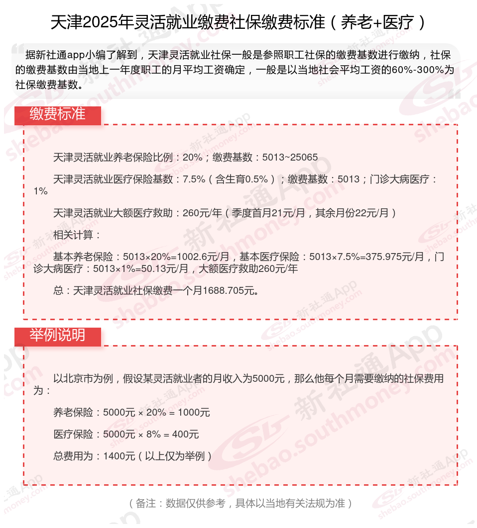 据新社通app数据显示,2024-2025年天津灵活就业人员养老保险的缴费标准是根据缴费基数来确定的: