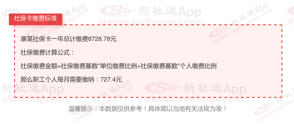 由上图得知,康某社保卡一年需要缴纳8728.78元,职工个人月缴纳727.4元,若您想要了解明细点击新社通社保计算器,来了解一下明细吧。