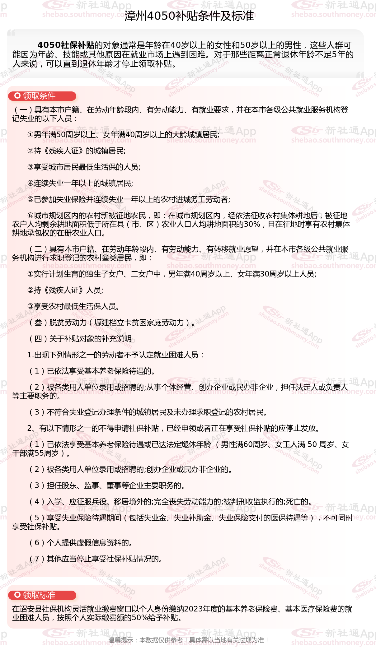 今天聊一下4050补贴的相关内容。4050补贴听起来像是一个针对特定年龄人群的社保补贴。比如女性需年满40周岁,男性需年满50周岁(以申请当年12月31日为截止日期)。那么漳州4050灵活就业困难人员社保补贴多少钱?漳州4050社保补贴可以申请吗?接下来随新社通APP小编具体了解一下4050社保补贴内容。