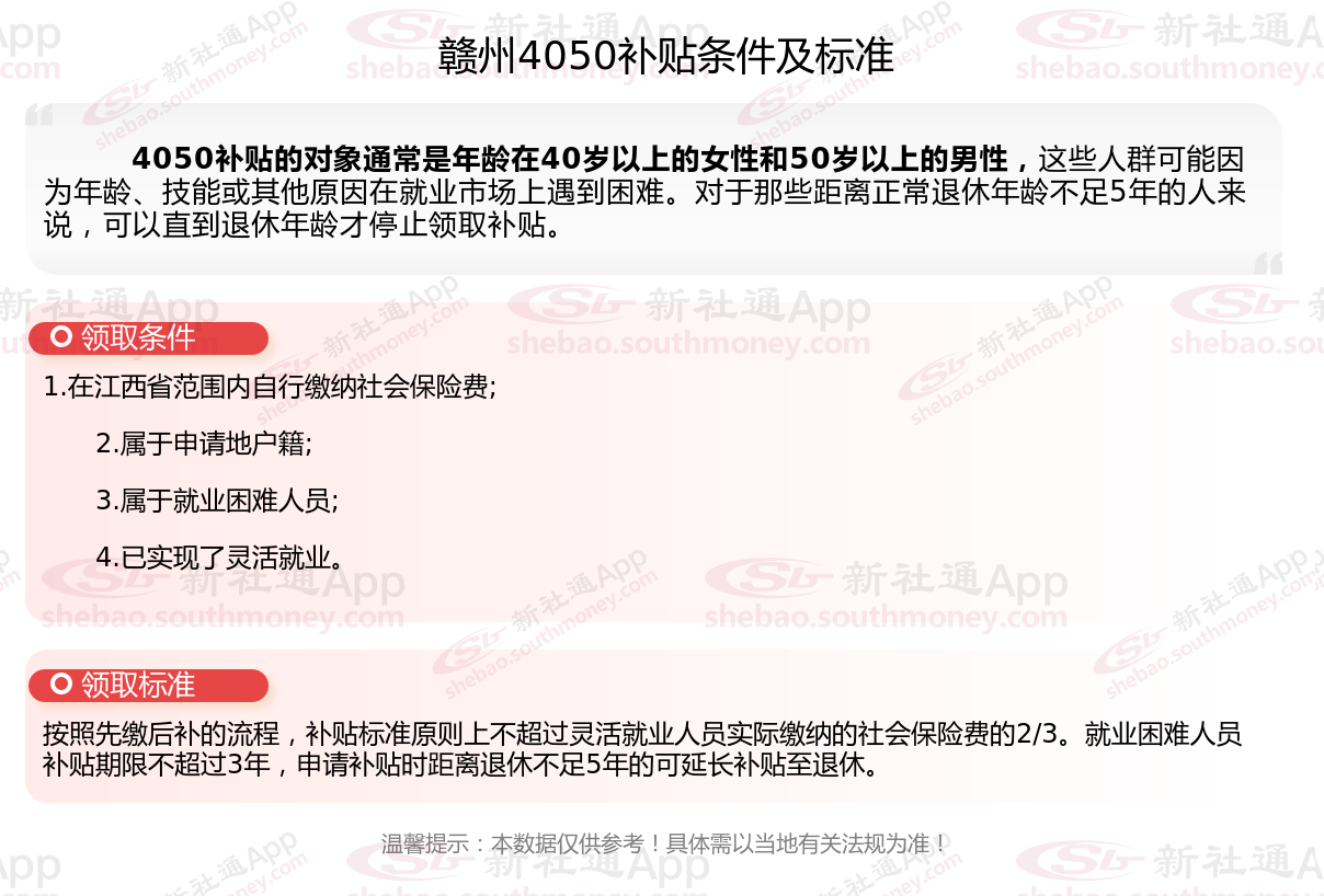 今天聊一下4050补贴话题。4050补贴听起来像是一个针对特定年龄人群的社保补贴。比如女性需年满40周岁,男性需年满50周岁(以申请当年12月31日为截止日期)。那么赣州4050灵活就业社保补贴标准是多少钱?赣州4050社保补贴条件是什么?接下来随新社通APP小编了解一下最新资讯。