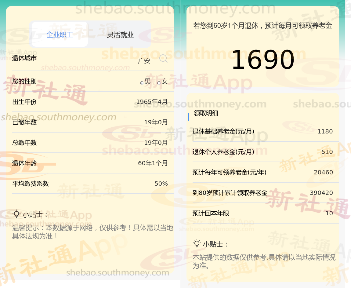 林某,退休地广安,出生于1965年,工龄19年,男性,缴费按50%档次。岁月流转,他终于迎来了自己的退休年龄。根据新社通app养老金在线计算器计算所得: