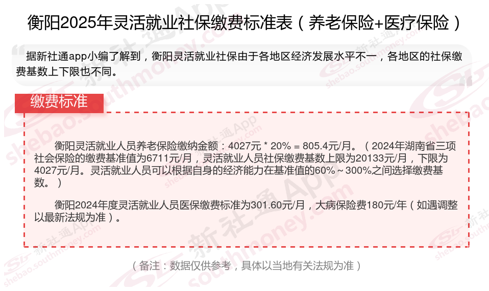 据新社通app数据显示,衡阳企业灵活就业养老保险的缴费基数为:4027元。
