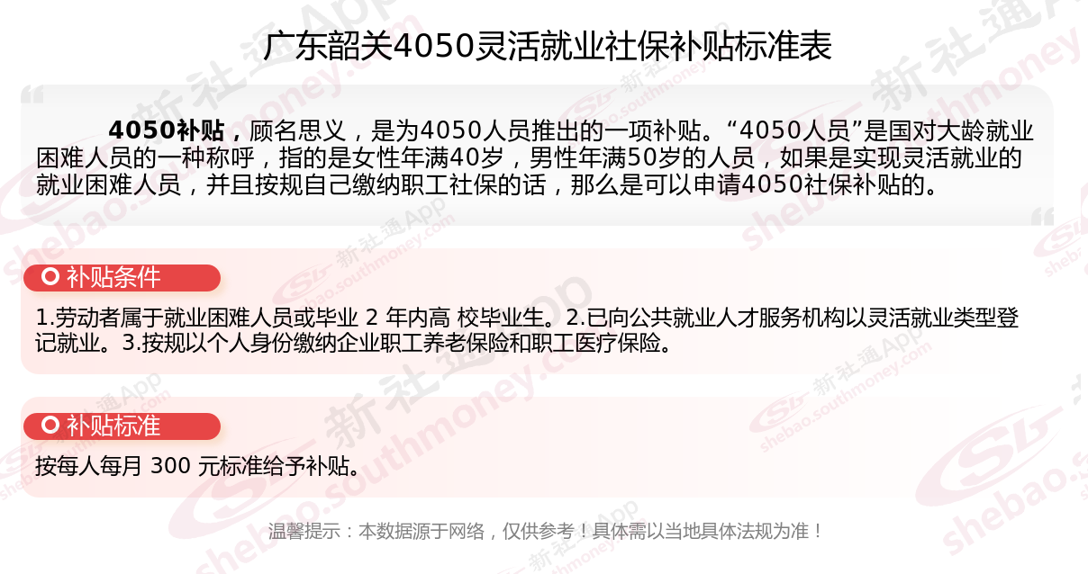 以上就是广东韶关4050灵活就业社保补贴的相关内容,欢迎关注新社通/下载新社通APP了解更多五险一金专业资讯。