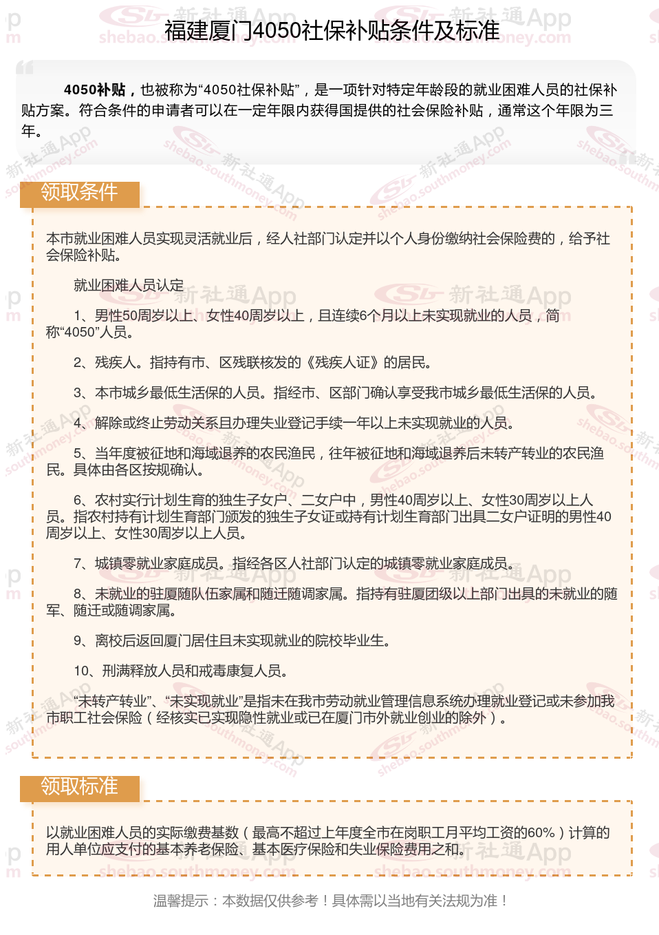 2025福建厦门4050补贴主要针对的是年龄在40岁以上的女性和50岁以上的男性,这些人群通常因为年龄较大而面临就业困难。