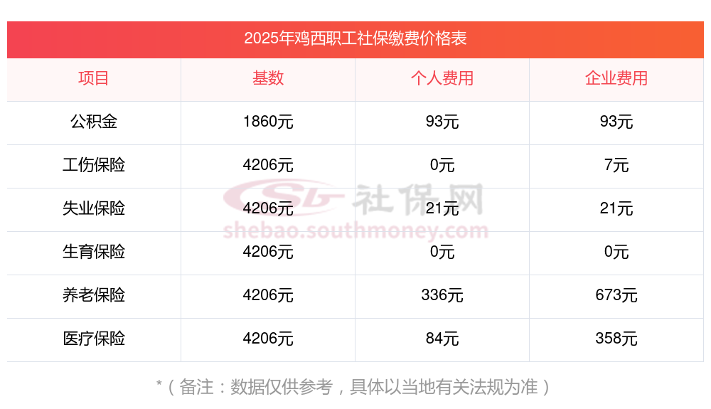 鸡西五险一金交多少钱一个月?下表是2024-2025年鸡西社保费用明细参考,新社通app-社保缴费查询工具提供的最新数据如下:
