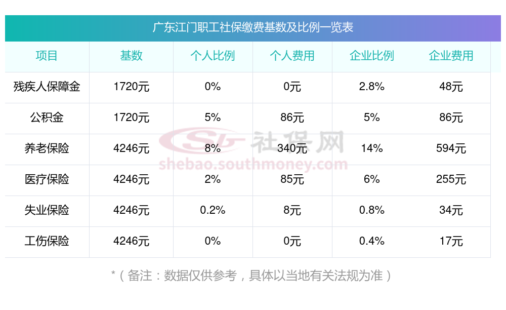 2025年广东江门社保缴费最低基数及个人和单位具体是多少钱?下表是2025年广东江门社保费用明细参考,新社通app-社保缴费查询工具提供的最新数据如下: