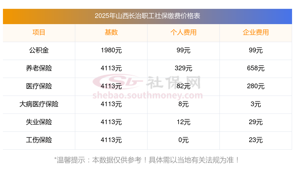 2025年山西长治社保缴费多少钱?下表是2024-2025年山西长治社保费用明细参考,新社通app-社保缴费查询工具提供的最新数据如下: