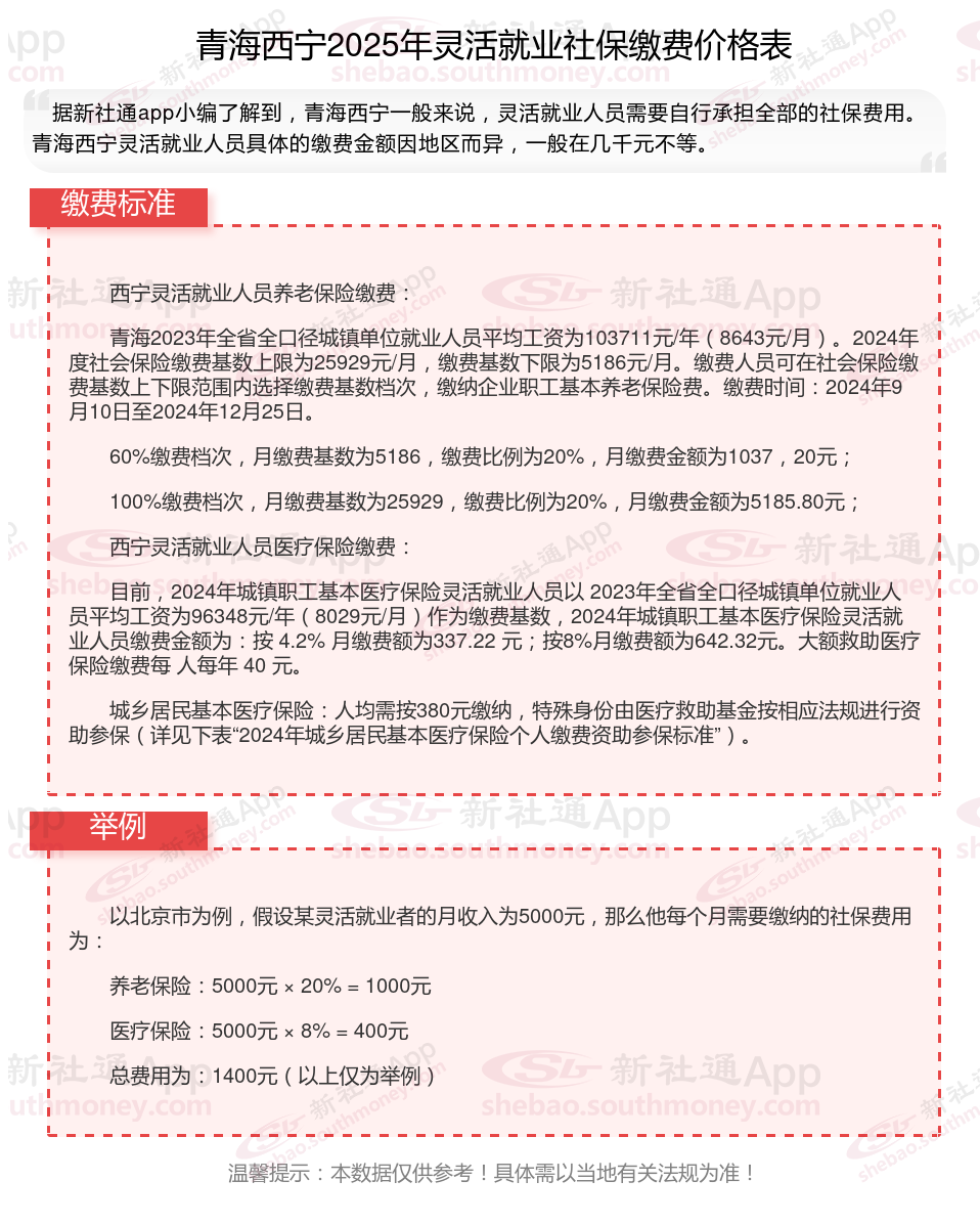 据新社通app数据显示,青海西宁灵活就业养老保险缴费基数2024-2025年最新标准如下: