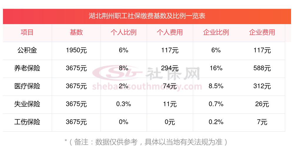 湖北荆州2025年社保养老保险缴费标准是多少?下表是2025年湖北荆州社保费用明细参考,新社通app-社保缴费查询工具提供的最新数据如下: