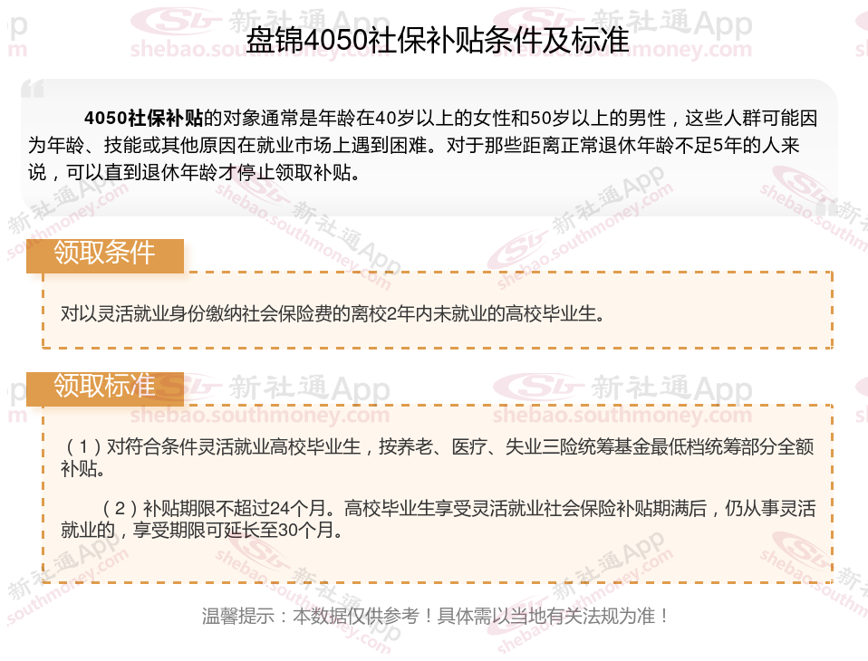 二、2025年盘锦4050社保补贴标准及条件
