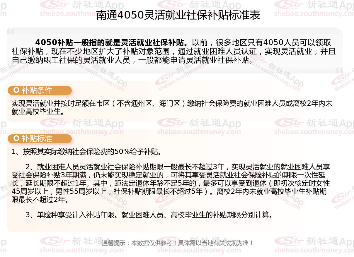 以上就是南通4050灵活就业社保补贴的相关内容,欢迎关注新社通/下载新社通APP了解更多五险一金专业资讯。
