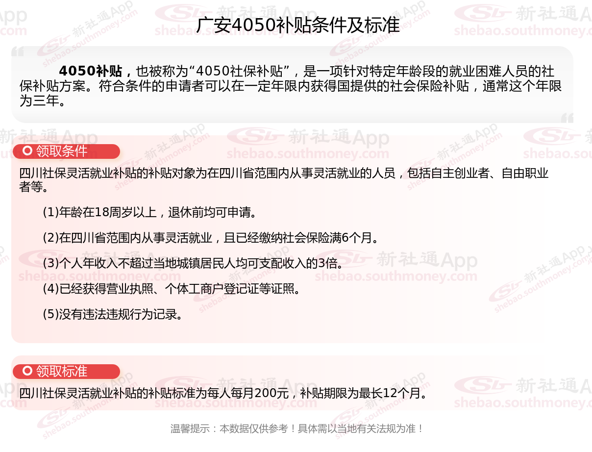 今天聊一下4050补贴话题。4050补贴听起来像是一个针对特定年龄人群的社保补贴。比如女性需年满40周岁,男性需年满50周岁(以申请当年12月31日为截止日期)。那么广安4050灵活就业社保补贴标准是多少钱?广安4050社保补贴条件是什么?接下来随新社通APP小编了解一下最新资讯。