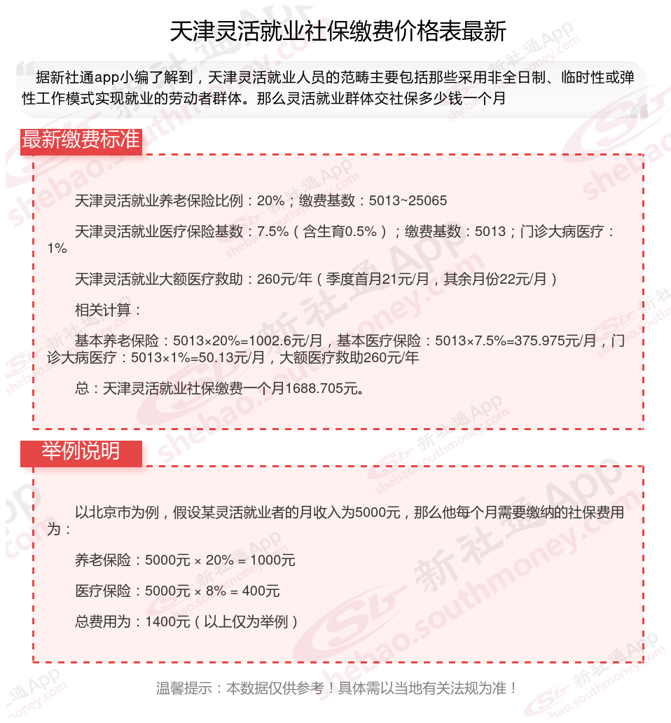据新社通app数据显示,天津灵活就业养老保险的缴费基数为:5013元。灵活就业人员参保缴费的比例为个人20%。
