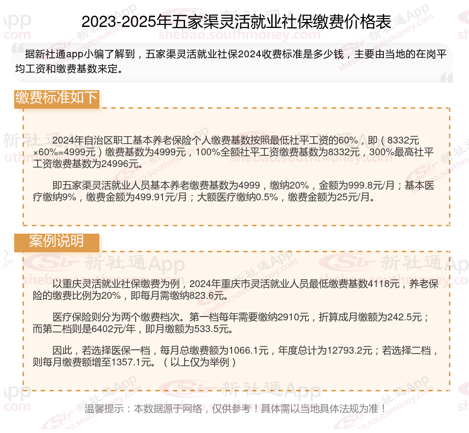即五家渠灵活就业人员基本养老缴费基数为4999,缴纳20%,金额为999.8元/月;基本医疗缴纳9%,缴费金额为499.91元/月;大额医疗缴纳0.5%,缴费金额为25元/月。