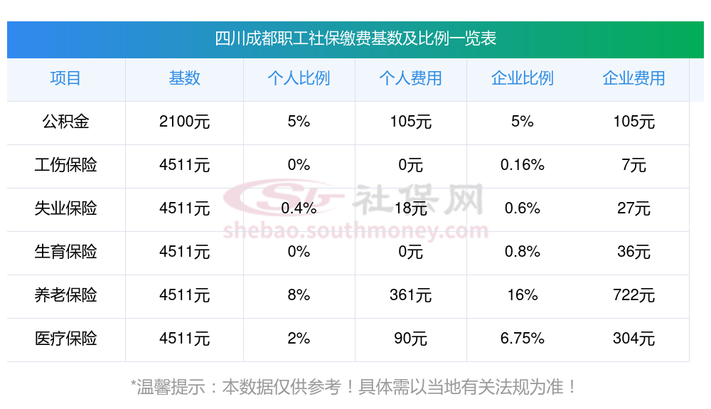 2025年四川成都社保缴费价格标准是多少,2025年四川成都社保缴费多少钱?下表是2025年四川成都社保费用明细参考,新社通app-社保缴费查询工具提供的最新数据如下: