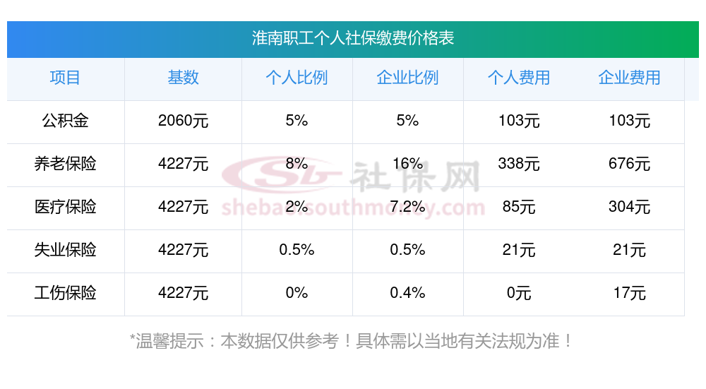 2025年淮南社保缴费多少钱?下表是2024-2025年淮南社保费用明细参考,新社通app-社保缴费查询工具提供的最新数据如下: