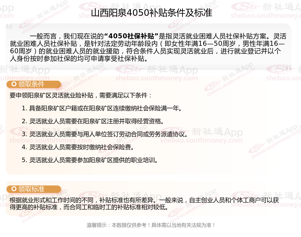 一、2025年山西阳泉灵活就业4050社保补贴标准及条件是什么