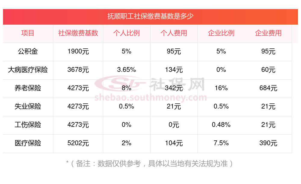 2025年抚顺5险缴费标准是多少,2025年抚顺社保缴费多少钱?下表是2025年抚顺社保费用明细参考,新社通app-社保缴费查询工具提供的最新数据如下: